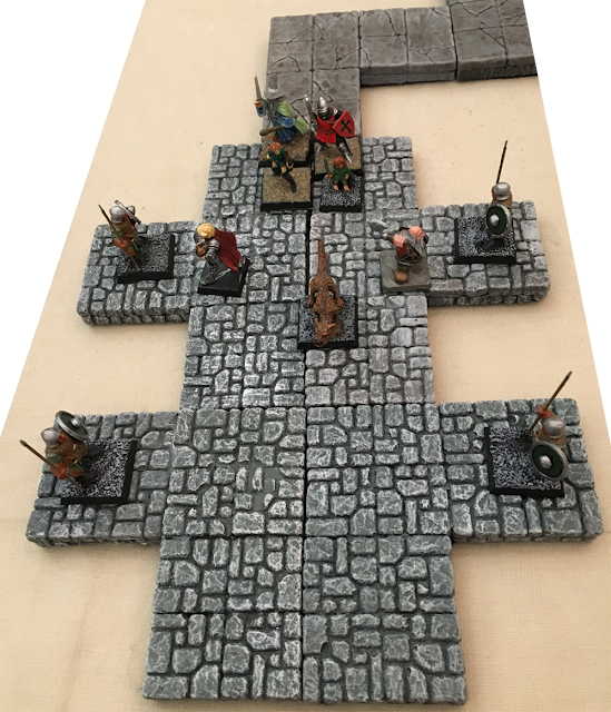 Through the doorway their was a corridor leading straight ahead. The corridor widened into a hallway and there stood eight skeletons on guard. As the party advanced a portcullis fell, separating the leading two adventures from the rest of the party.